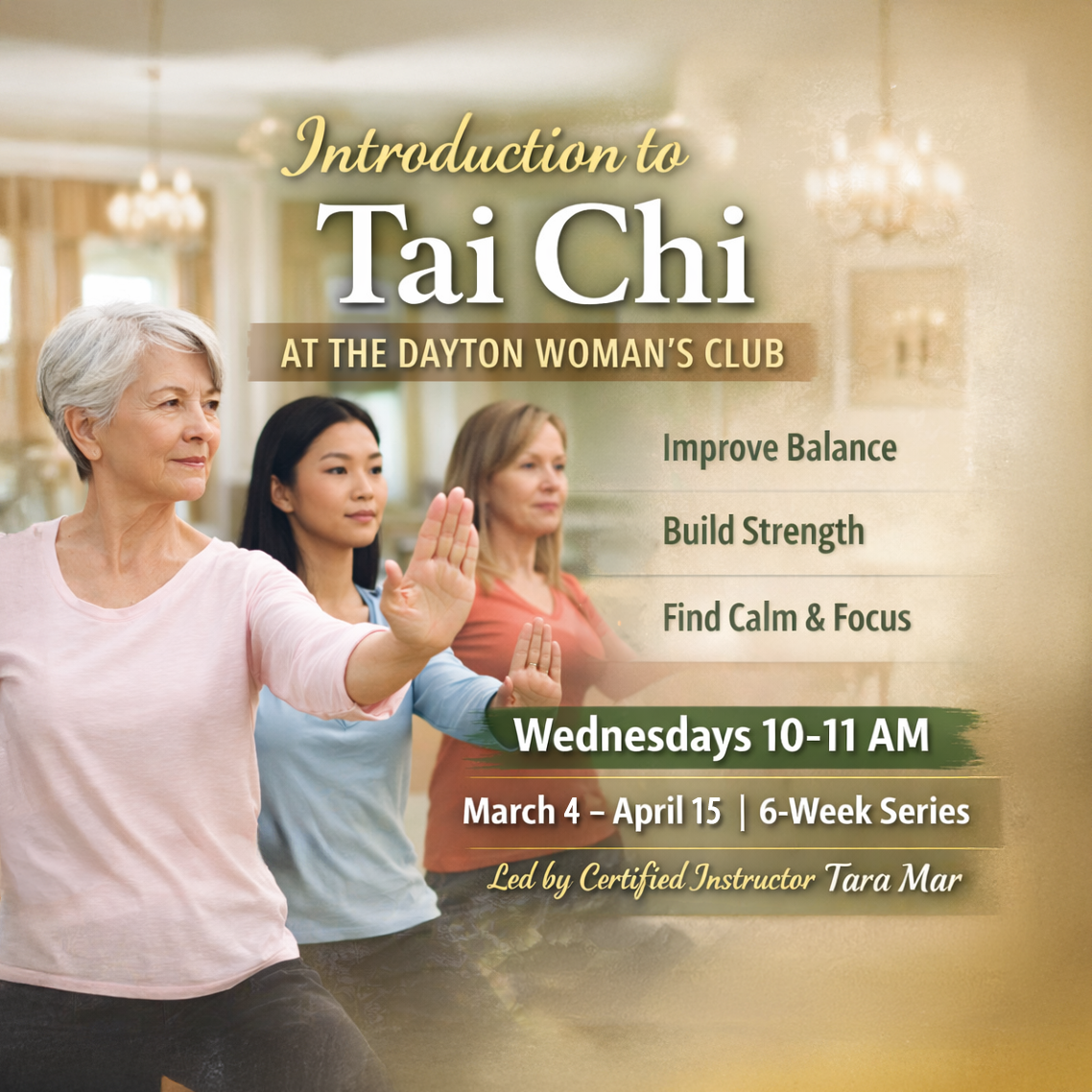 Experience the traditional art of Tai Chi in the beautiful setting of The Dayton Woman’s Club ballroom, led by Tara Mar, Certified Lai Tung Pai Style Instructor. This gentle, low-impact practice supports strength, balance, flexibility, and focus — especially beneficial for seniors. Chairs are available for added support.