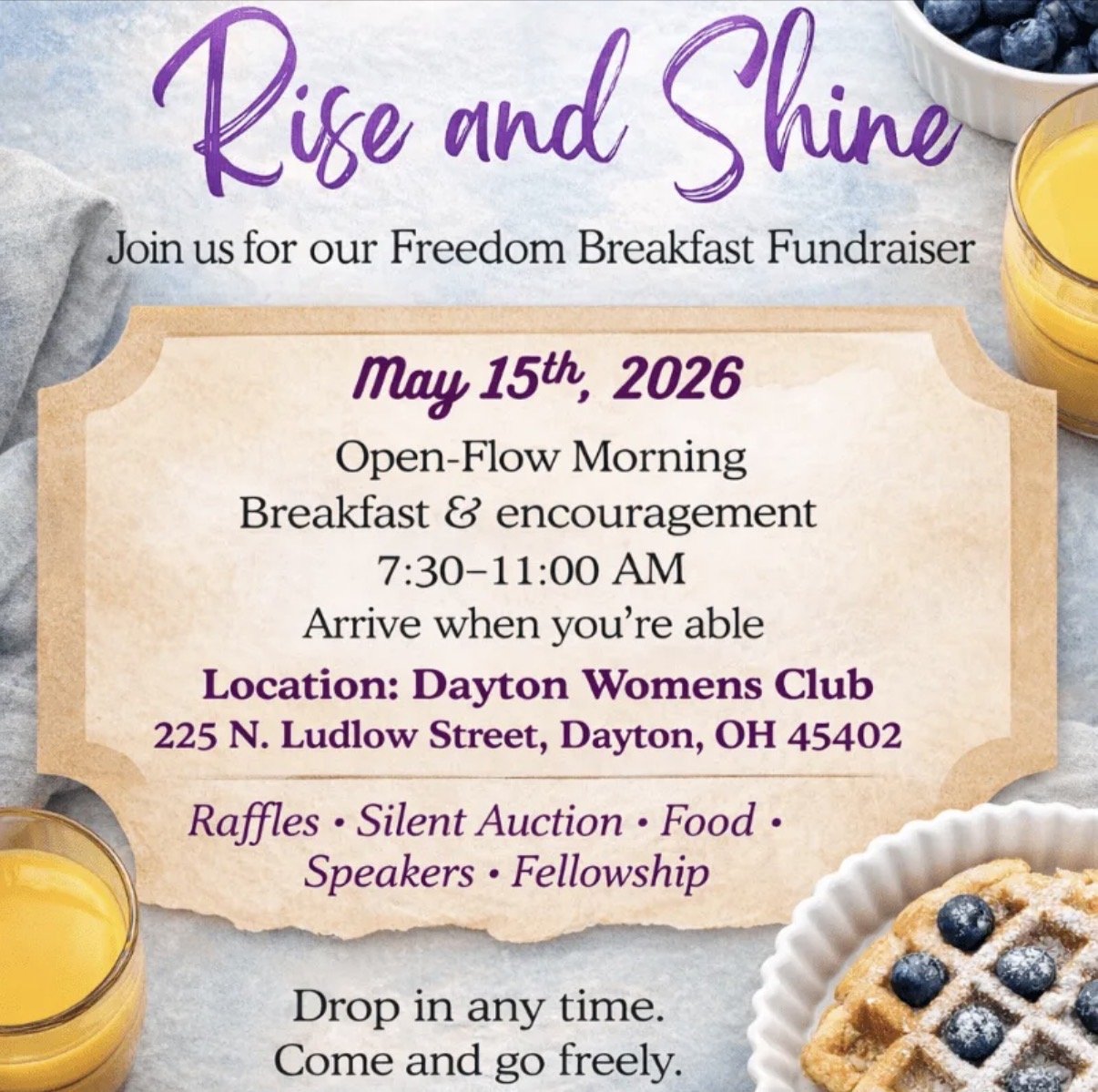 Join us for an open-flow morning with breakfast, speakers, silent auctions, raffle baskets, and amazing fellowship. Arrive when you are able.